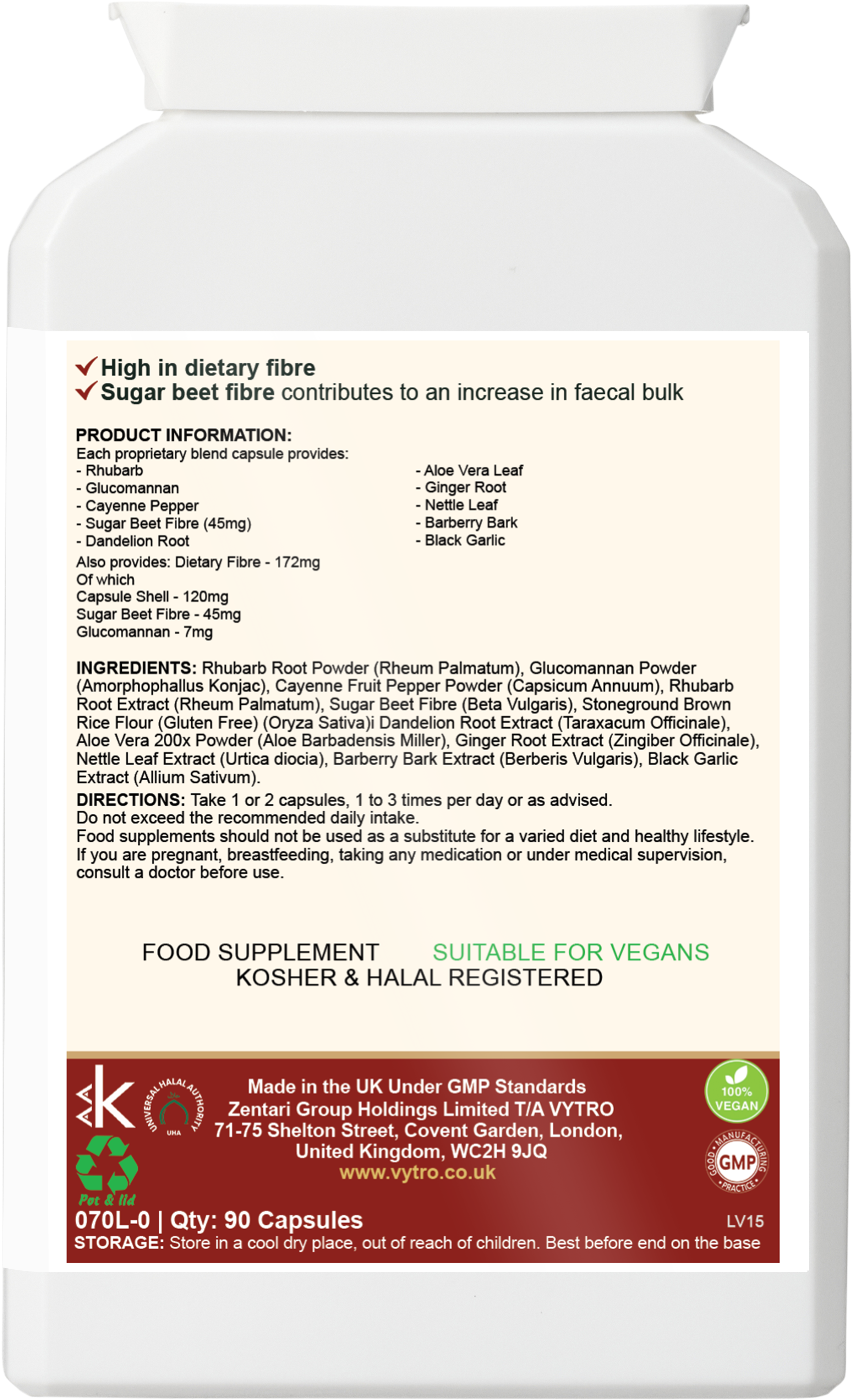 It combines traditional herbal laxatives such as Rhubarb Root, Aloe Vera and Dandelion Root with natural fibres including Sugar Beet and Glucomannan to te regular bowel movements and restore digestive balance.