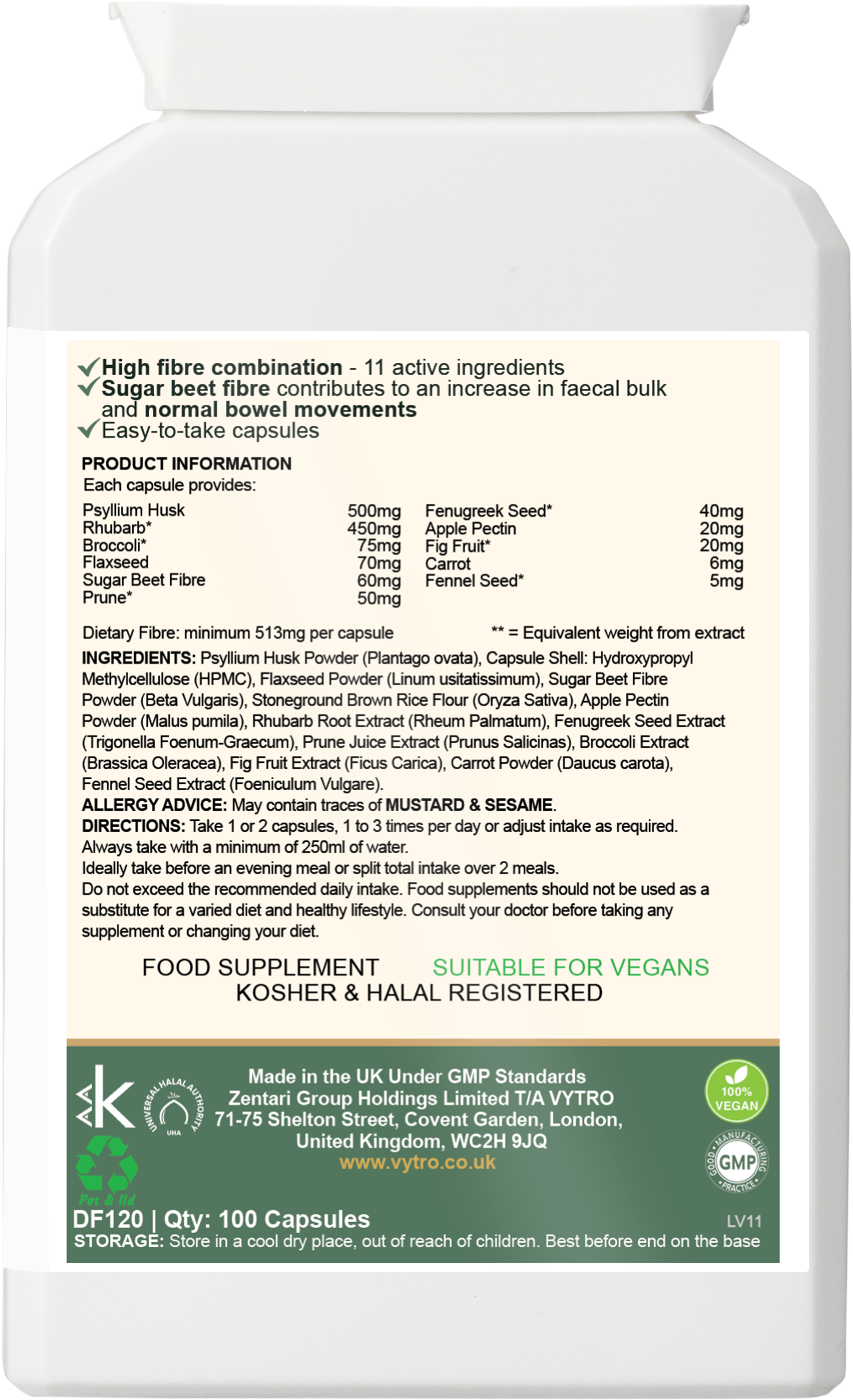 Ingredients: Psyllium Husk Powder (Plantago ovata), Capsule Shell: Hydroxypropyl Methylcellulose (HPMC), Flaxseed Powder (Linum usitatissimum), Sugar Beet Fibre Powder (Beta vulgaris), Stoneground Brown Rice Flour (Oryza sativa), Apple Pectin Powder (Malus pumila), Rhubarb Root Extract (Rheum palmatum), Fenugreek Seed Extract (Trigonella foenum-graecum), Prune Juice Extract (Prunus salicinas), Broccoli Extract (Brassica oleracea), Fig Fruit Extract (Ficus carica), Carrot Powder (Daucus carota), Fennel Seed Extract (Foeniculum vulgare).