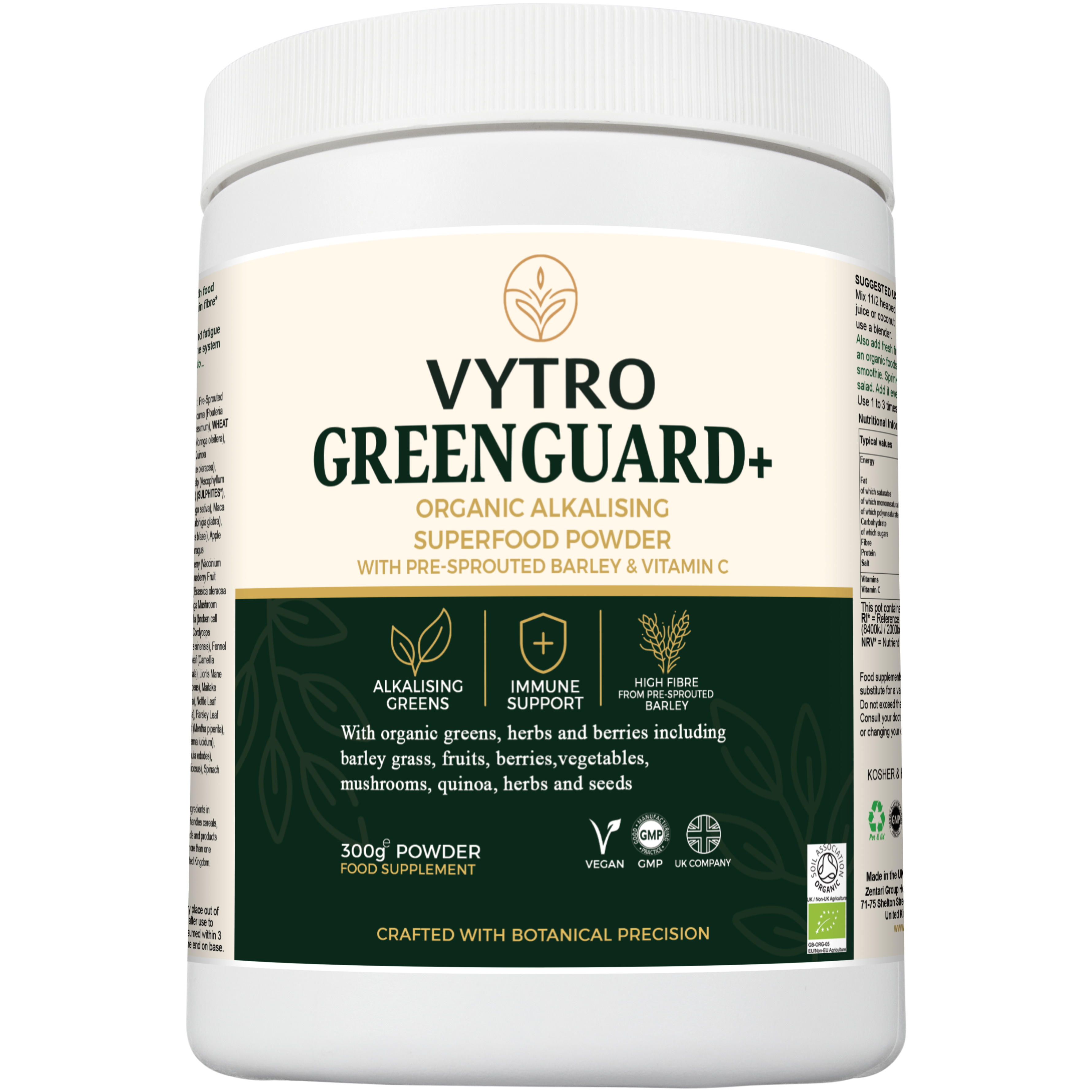 🌿 VYTRO GREENGUARD+ is a premium organic alkalising superfood blend powered by over 35 plant-based ingredients — including pre-sprouted activated barley, wheatgrass, spirulina, chlorella, turmeric, and moringa. Formulated to deliver clean, whole-food nutrition in every scoop, it’s your daily green energy and immune-support powerhouse.