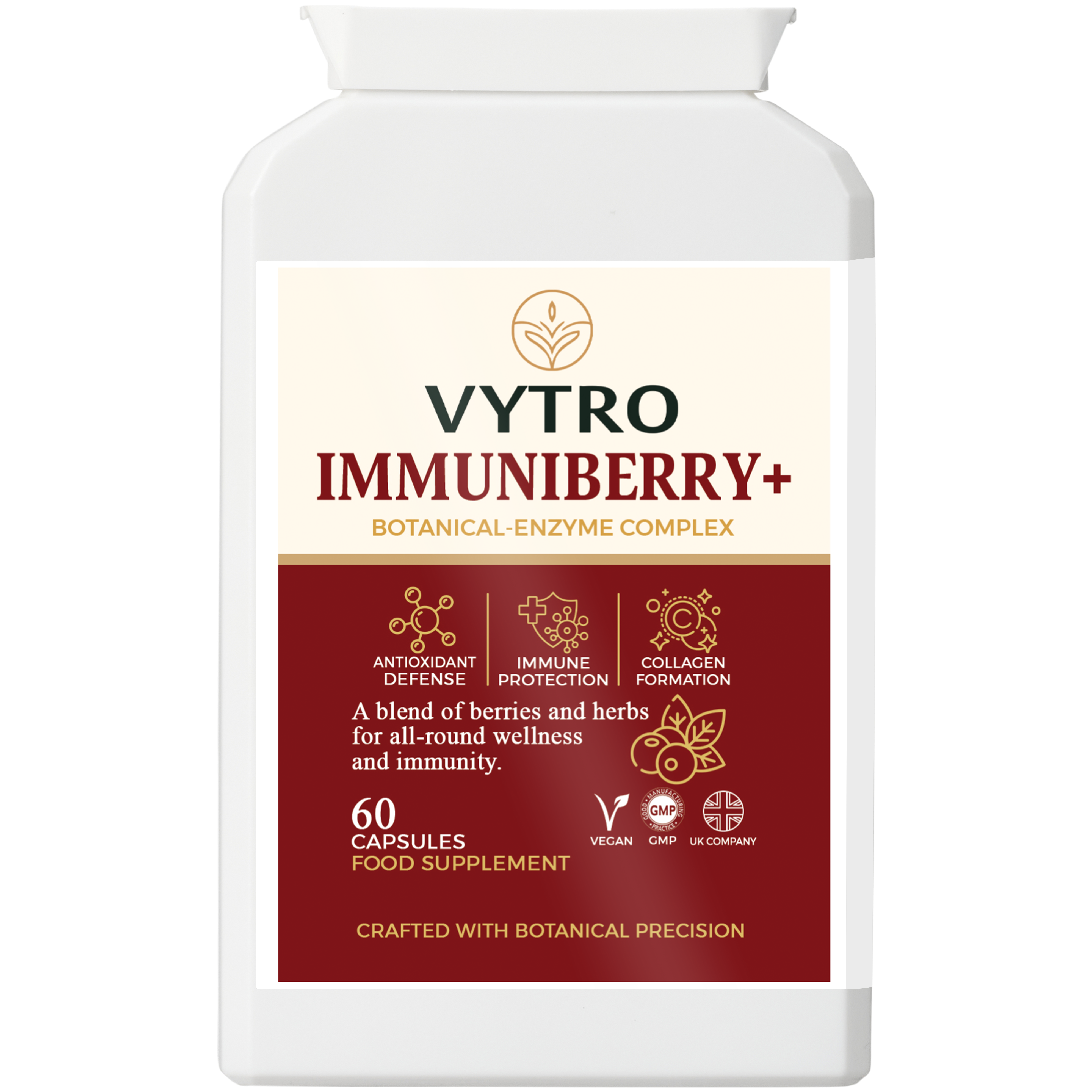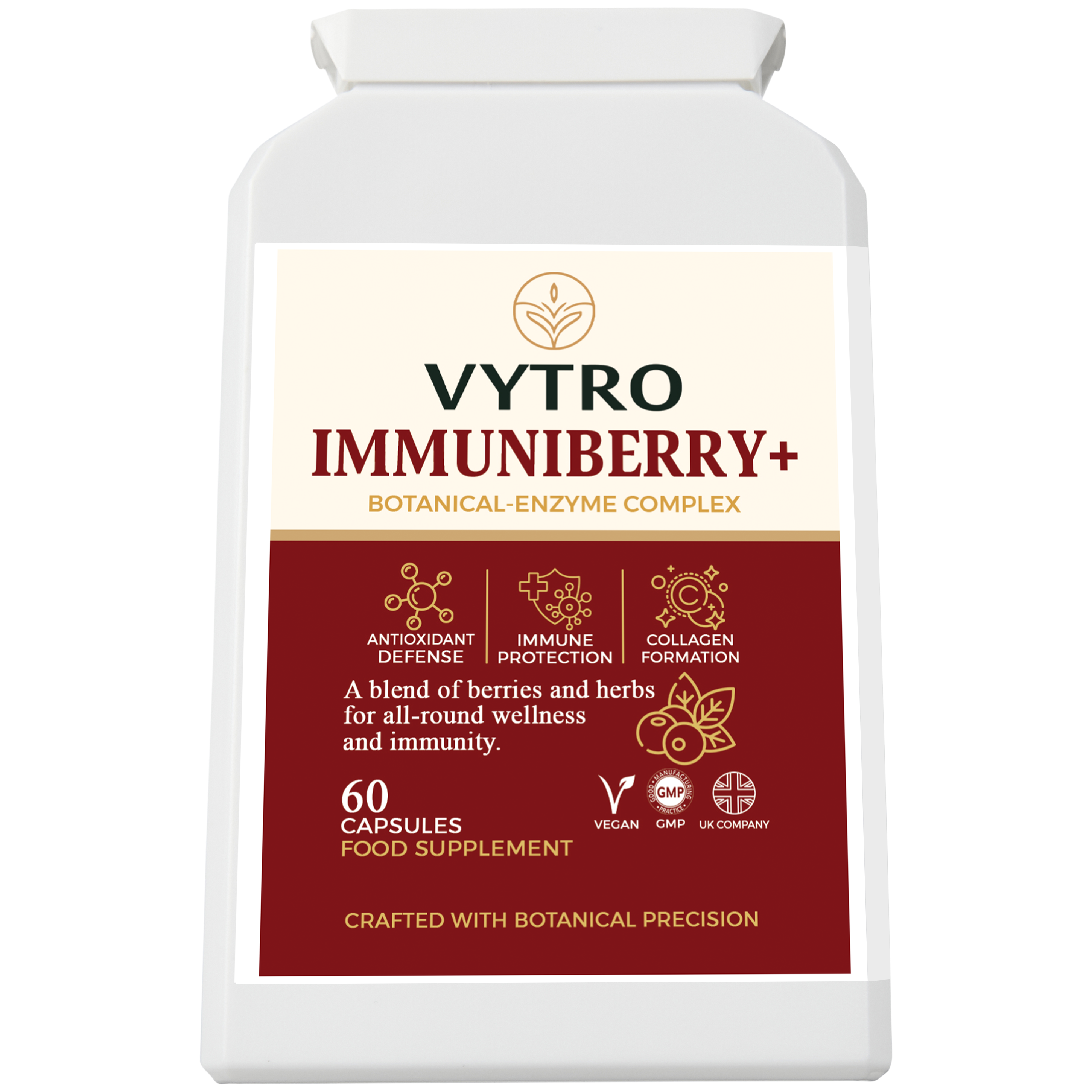🌿 VYTRO IMMUNIBERRY+ is a premium food-based Vitamin C and berry enzyme complex crafted to strengthen the immune system, reduce tiredness, and support collagen formation for radiant skin and joint vitality.