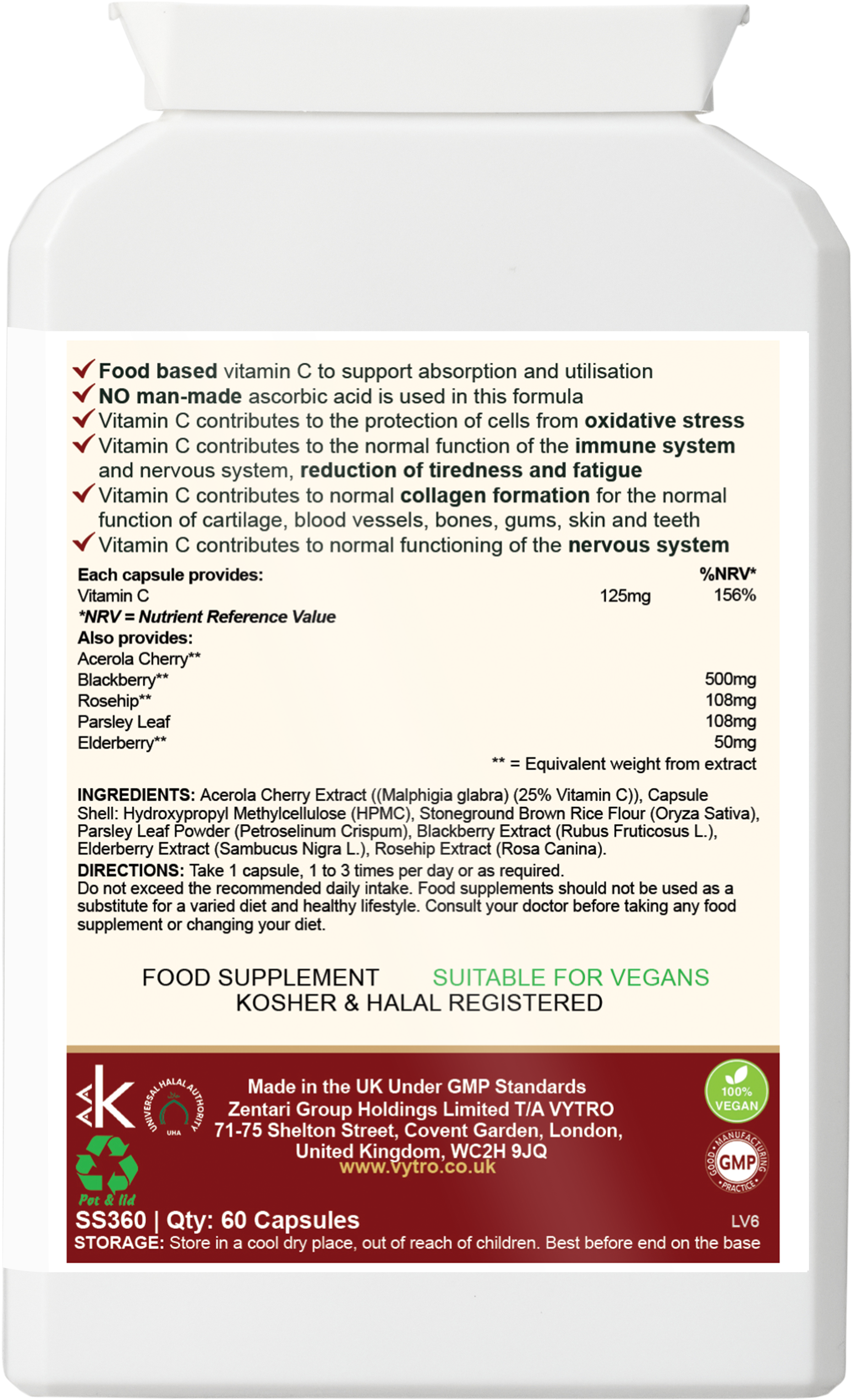 • Natural food-form Vitamin C – no synthetic ascorbic acid