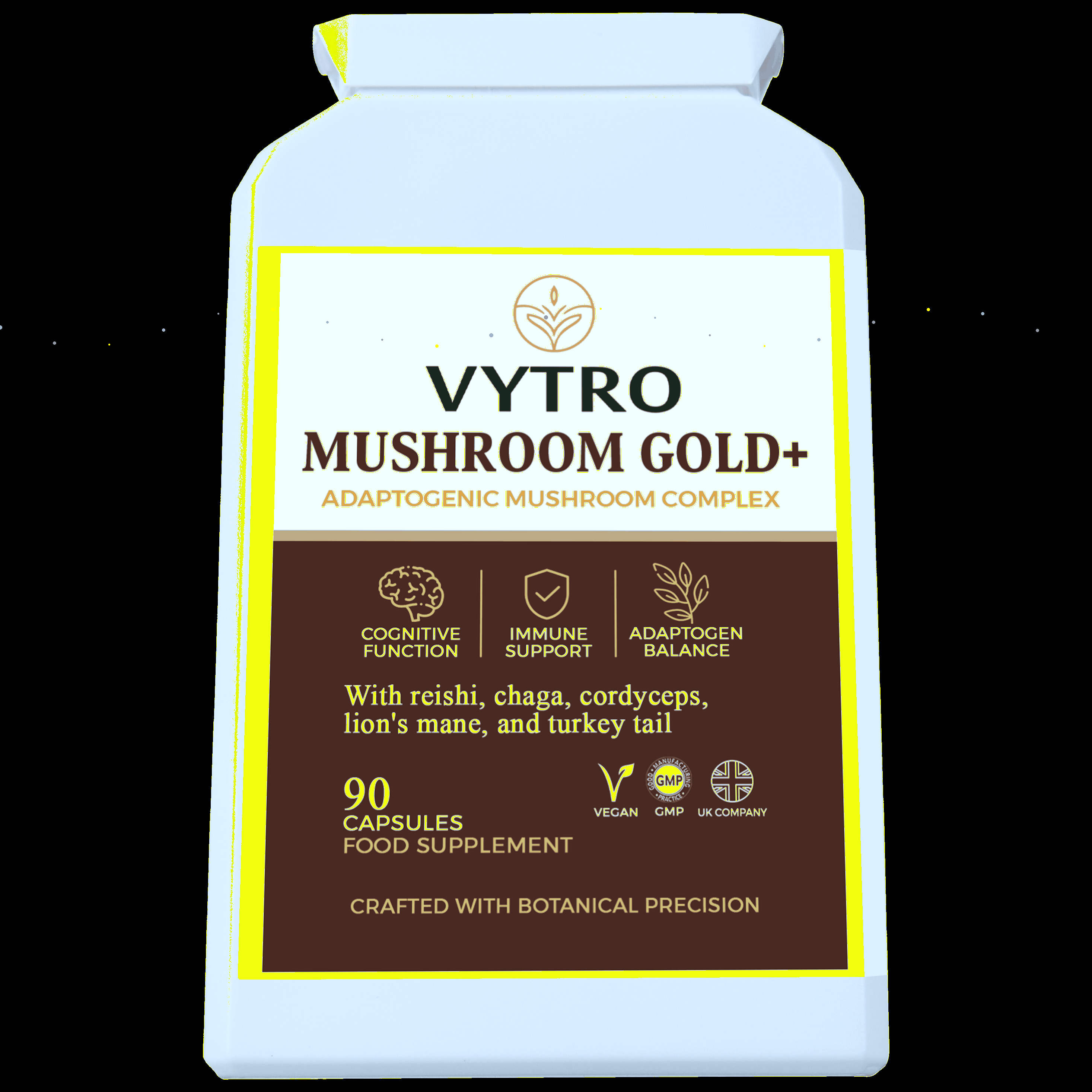 🧠 VYTRO MUSHROOM GOLD+ is a certified organic adaptogenic mushroom blend combining five premium medicinal mushrooms—Reishi, Lion’s Mane, Chaga, Shiitake, and Maitake—with Astragalus Root, Acerola Fruit (natural Vitamin C), and Black Pepper for enhanced bioavailability.