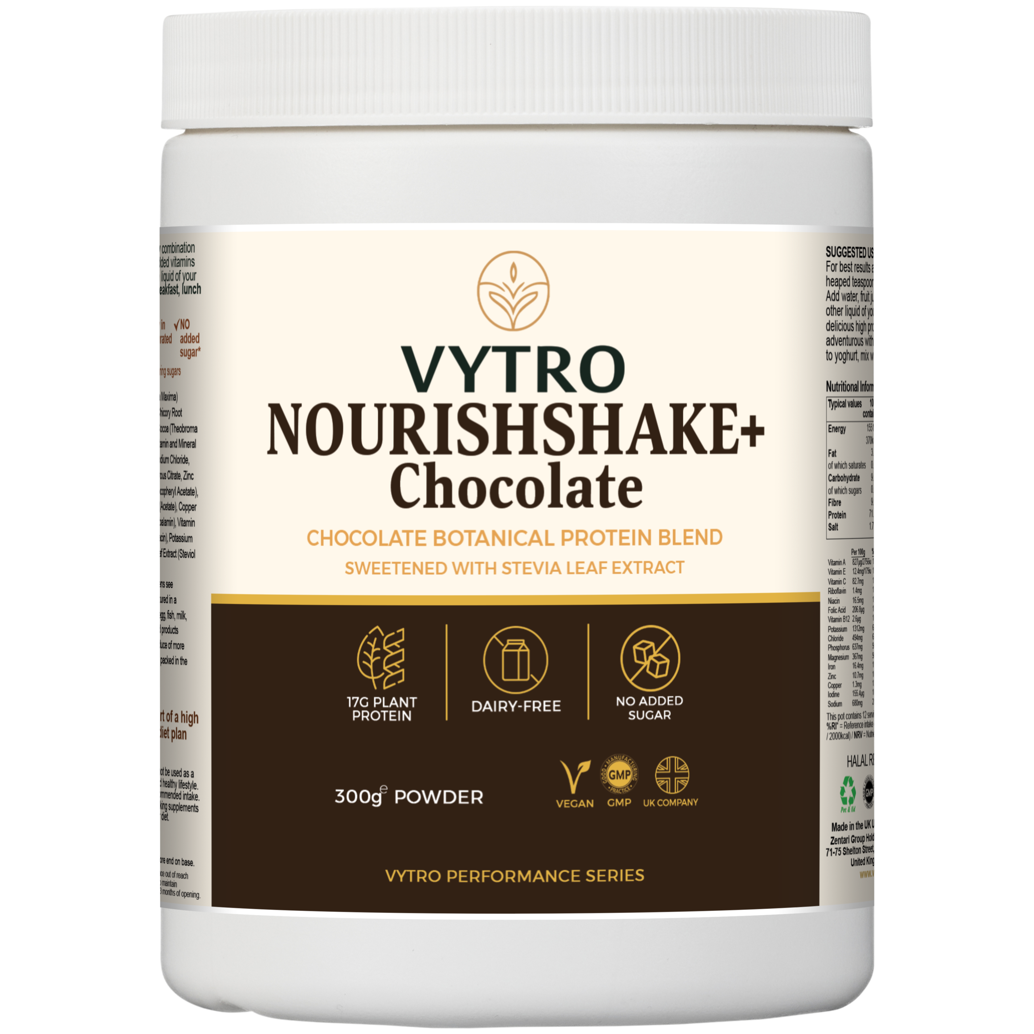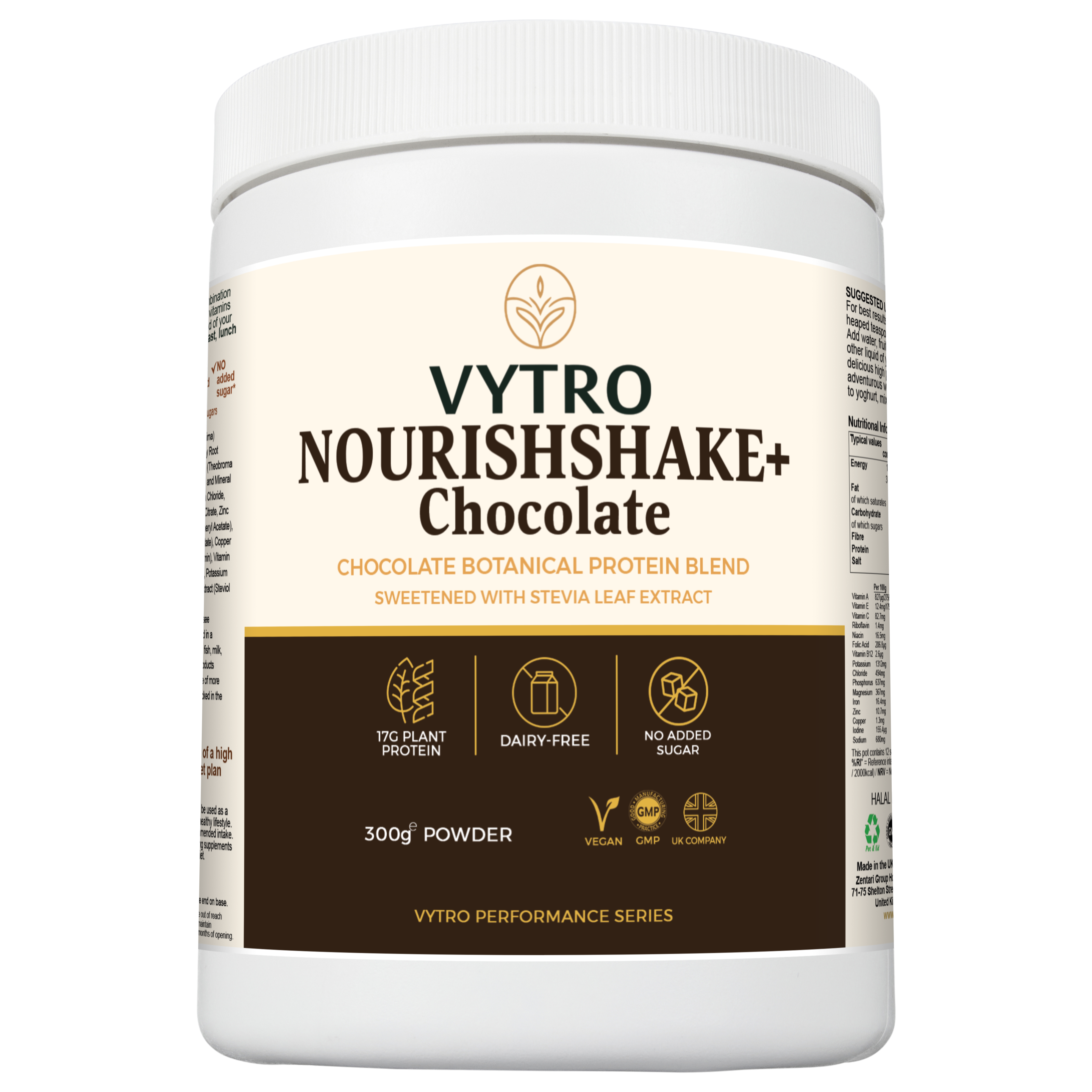 <p><strong>VYTRO® NOURISHSHAKE+ Chocolate</strong> is a smooth, plant-powered protein shake crafted for everyday vitality. Featuring 17g of complete protein per serving, this formula blends botanicals, vitamins, and minerals for a balanced source of energy, recovery, and nourishment — without dairy, soy, or added sugar.</p>
